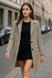 הג׳קט עשוי בד סריג איכותי עם מגע רך וחמים, בדוגמה גיאומטרית קלאסית בגווני שמנת ושחור. הגזרה שלו ארוכה ומחמיאה, נופלת בצורה נקייה שמאריכה את הגוף. יש לו צווארון מחויט שנותן מראה יוקרתי, כפתורים קדמיים בגוון שחור שמוסיפים עומק, ושתי כיסים נוחים שמשלימים את הסגנון.