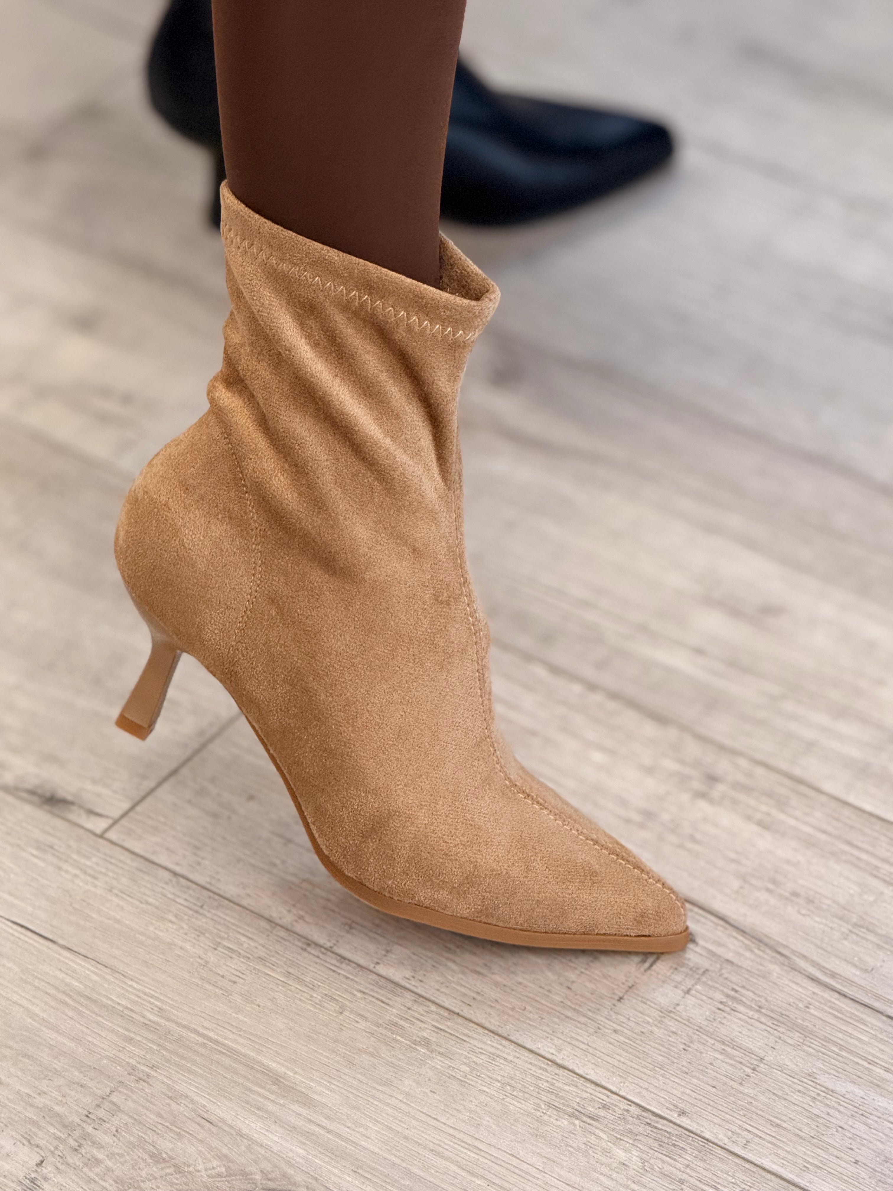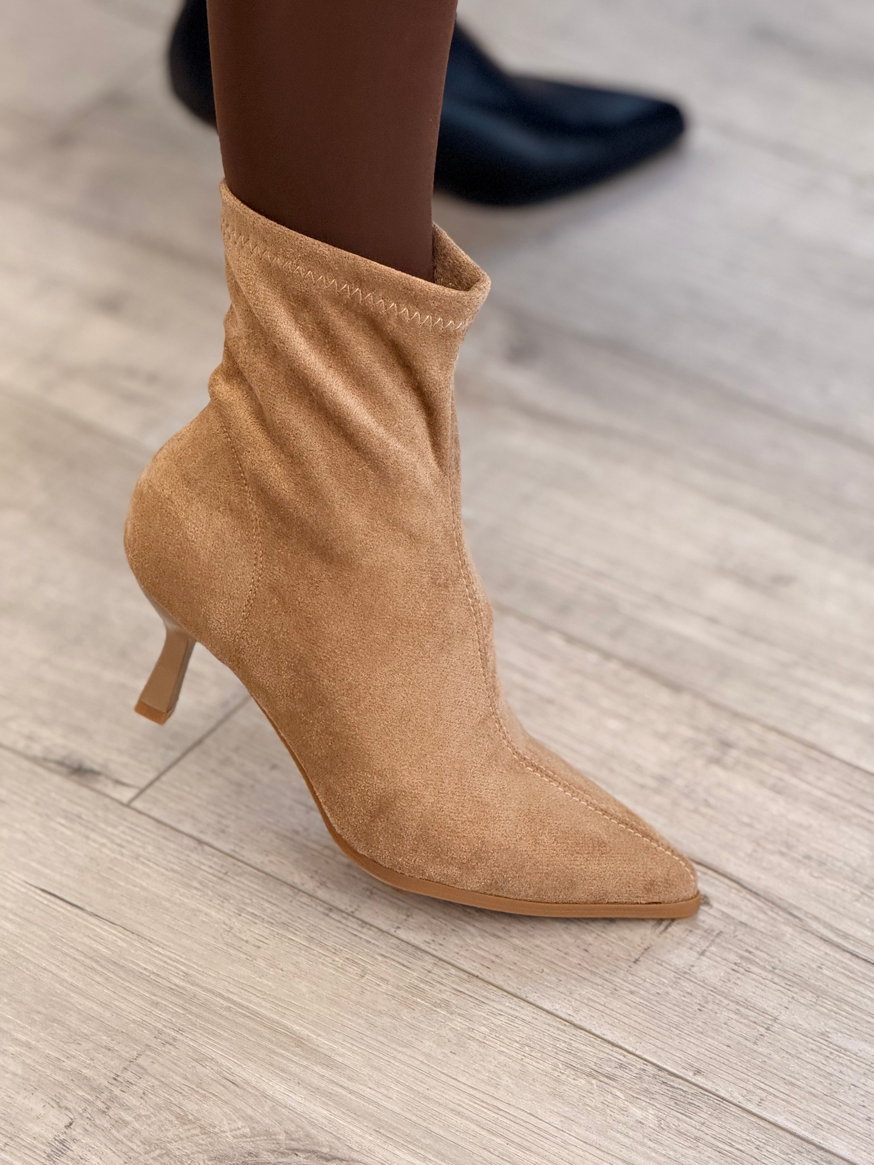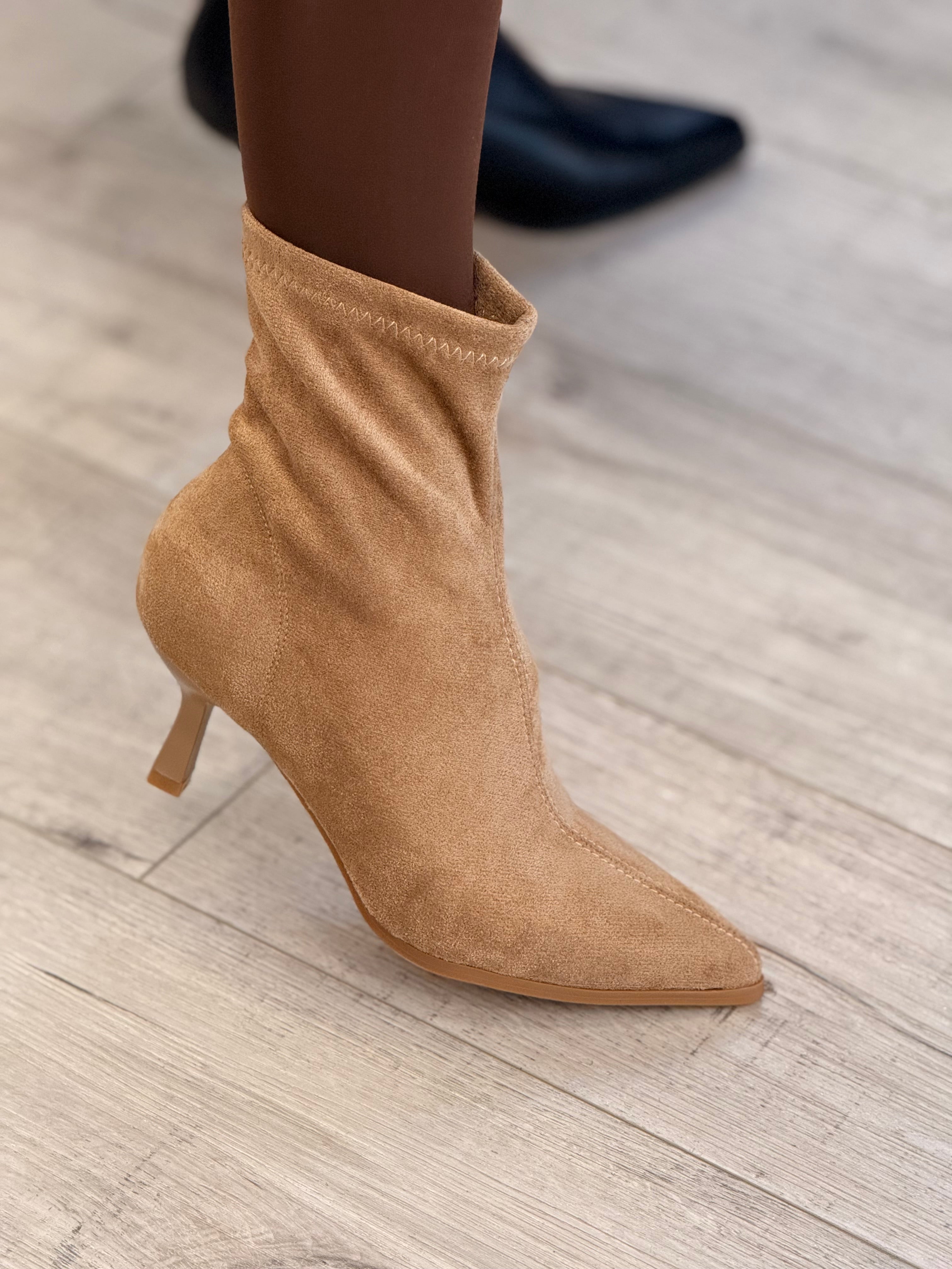מגף עקב אלגנטי בגימור חלק, עם חרטום מחודד ועקב דק ונשי.