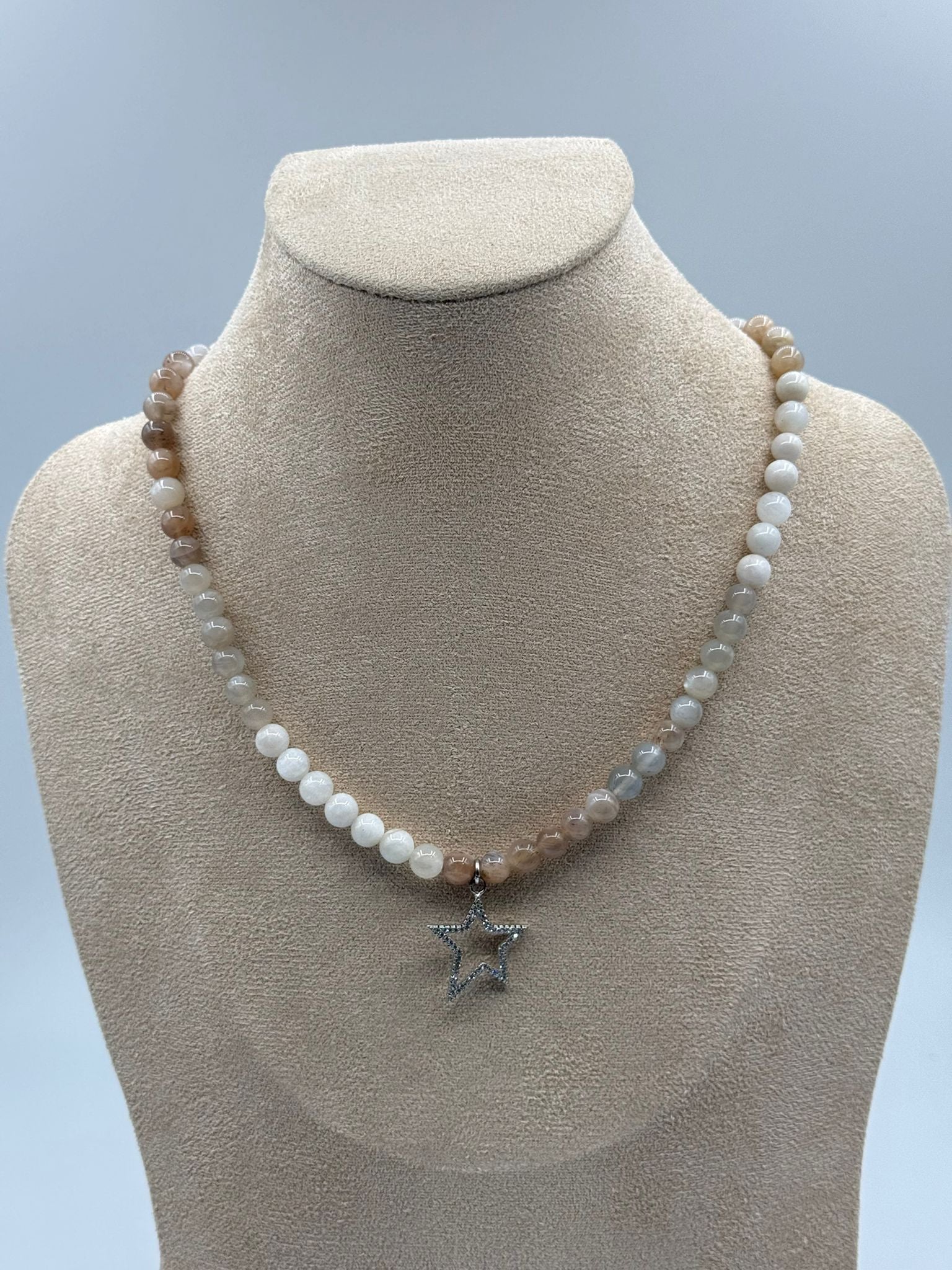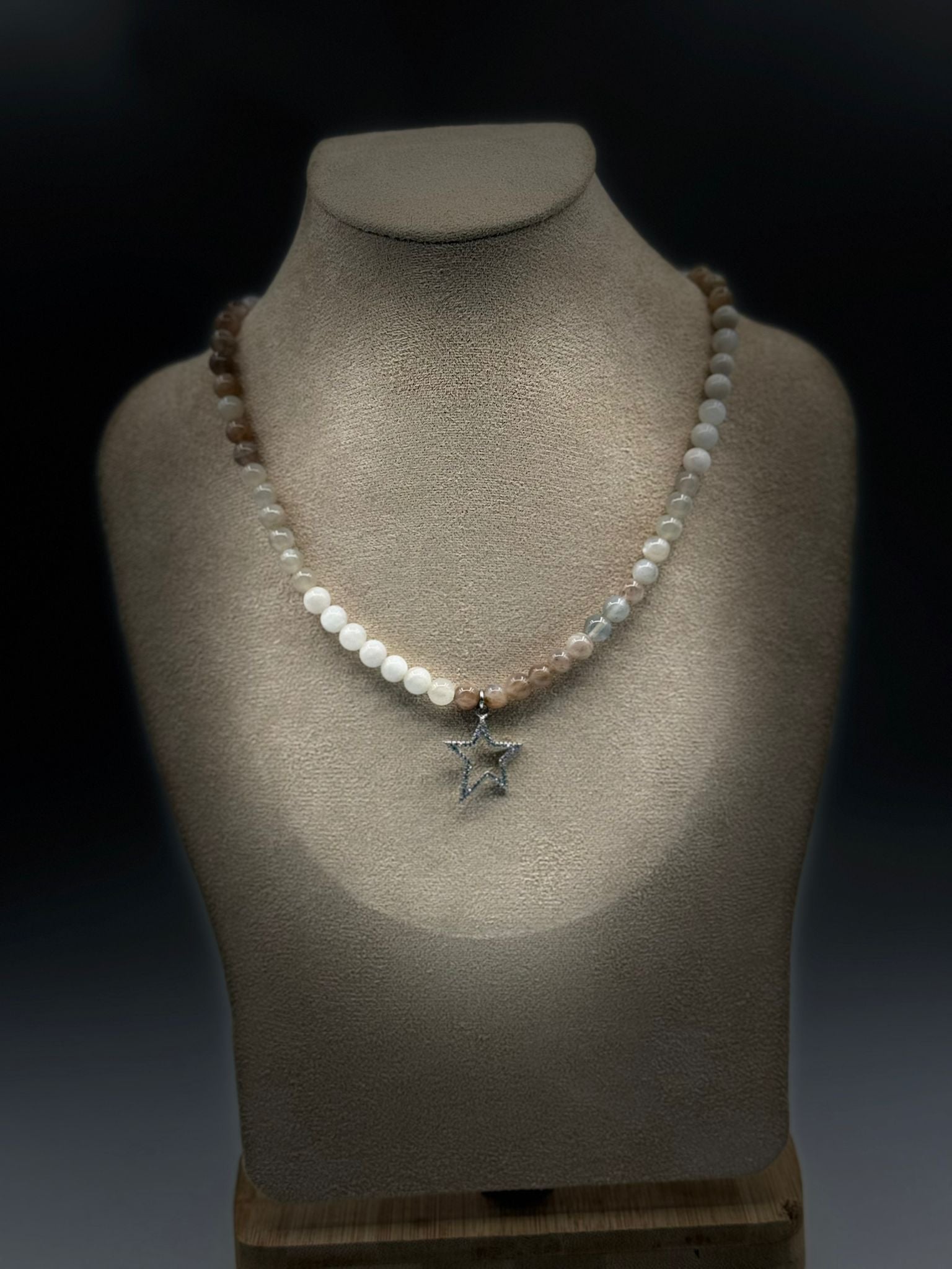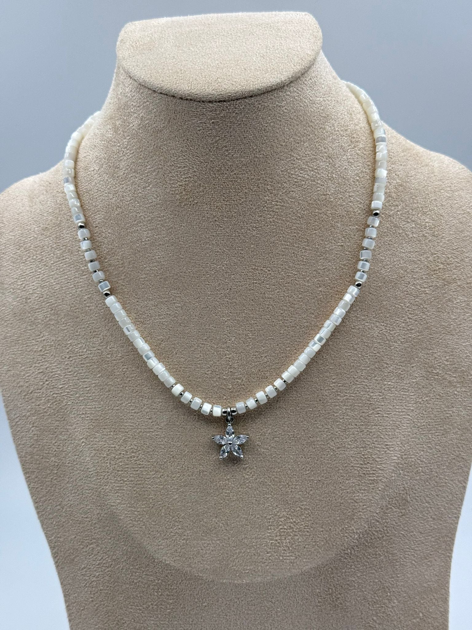 השרשרת בתמונה מציגה עיצוב עדין ומודרני המשלב חרוזים אלגנטיים ותליון ייחודי בצורת פרח נוצץ.