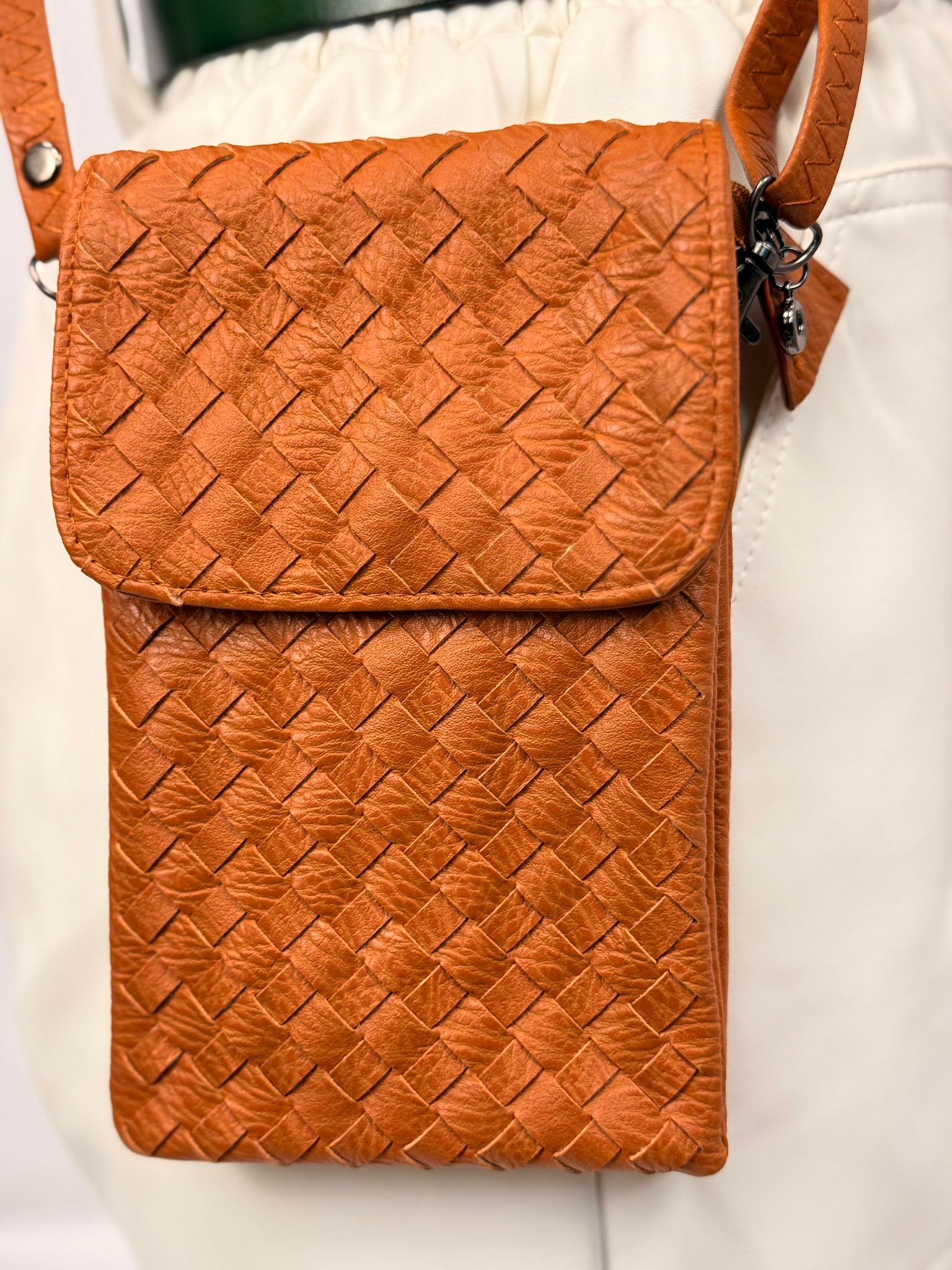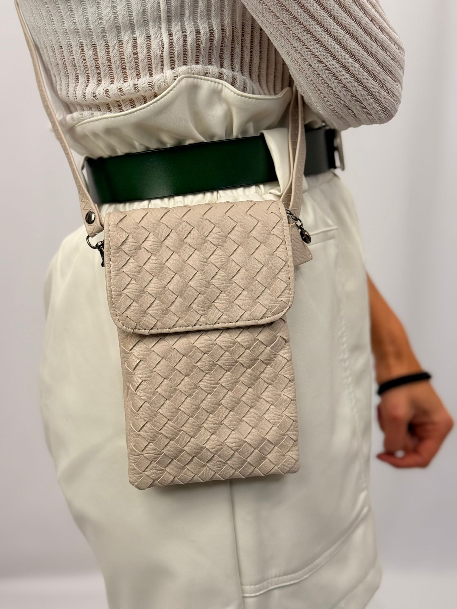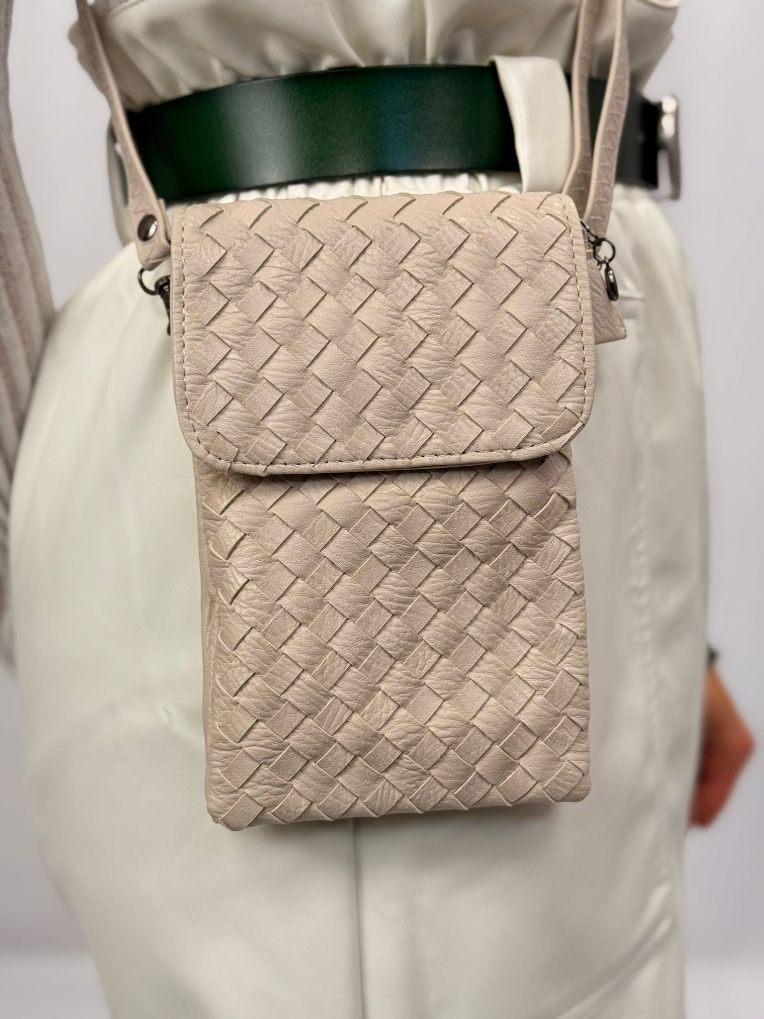 התיק שבתמונה הוא תיק קטן, עשוי חומר דמוי עור עם דוגמת אריגה שמעניקה לו מראה יוקרתי ומסוגנן. צבעו נייטרלי, בגוון קרם, מה שהופך אותו למתאים לשימוש יומיומי או כאביזר אופנתי לאירועים שונים. עיצובו הקומפקטי מתאים לנשיאת פריטים קטנים כמו טלפון, מפתחות או ארנק.