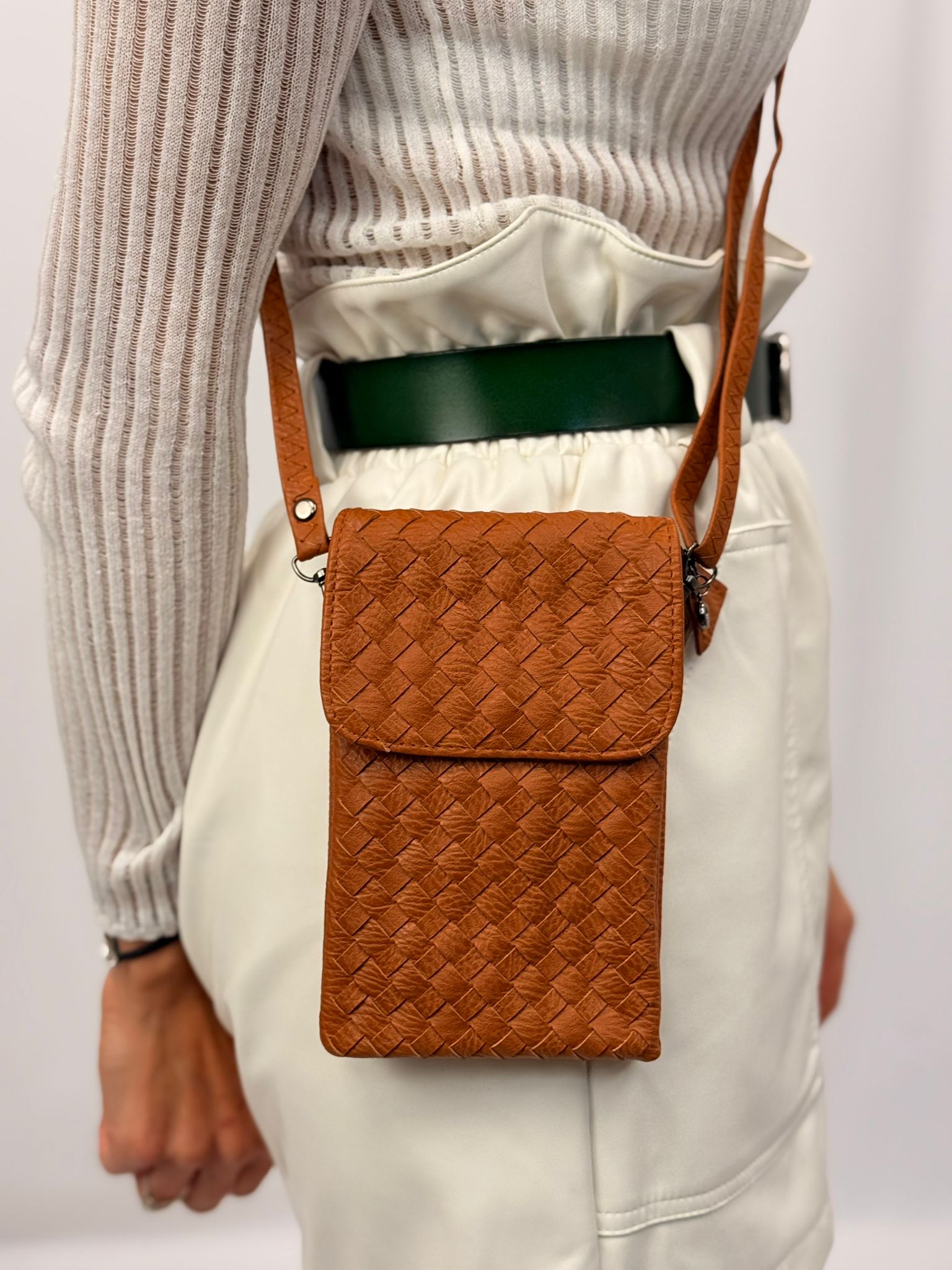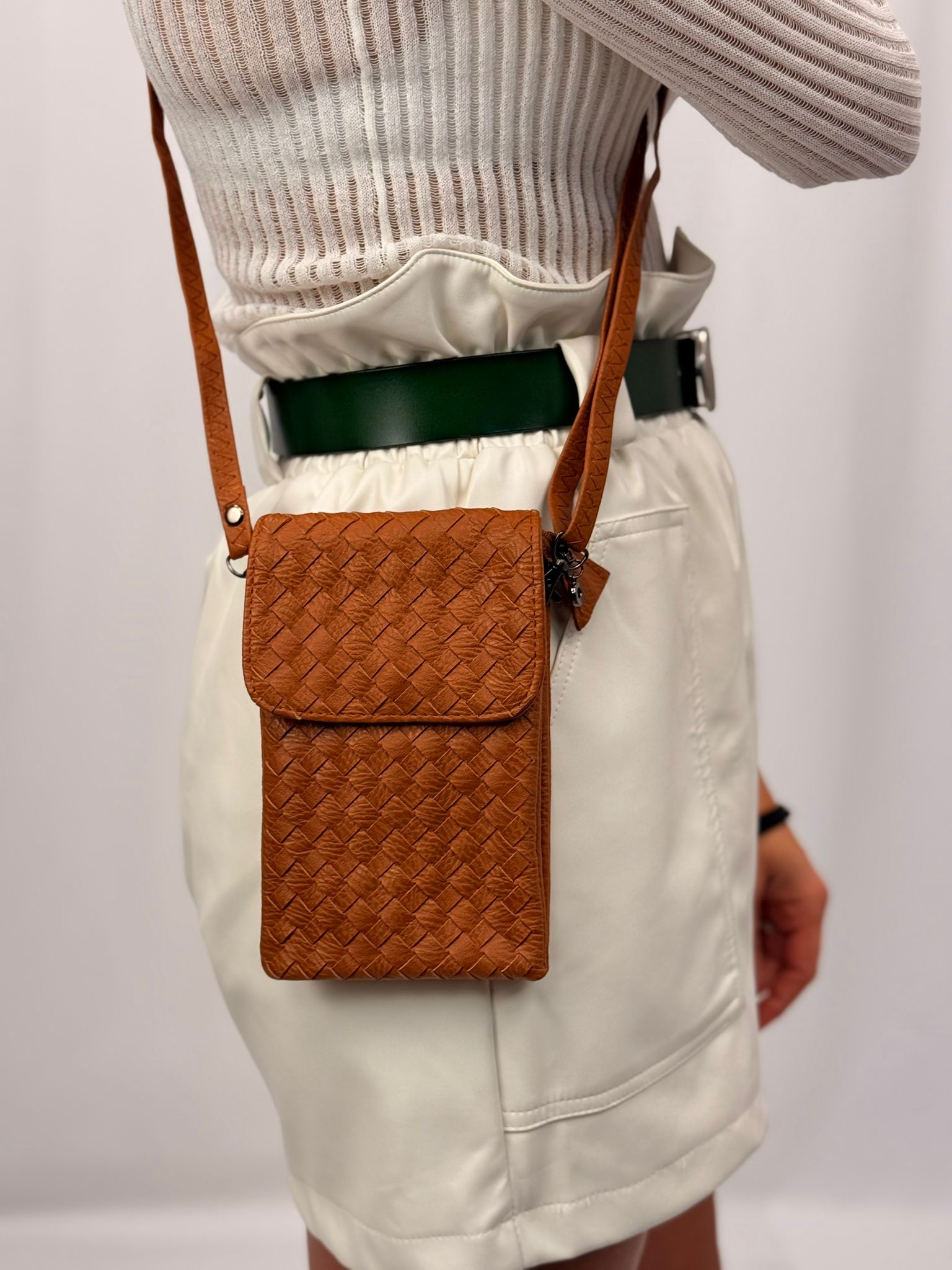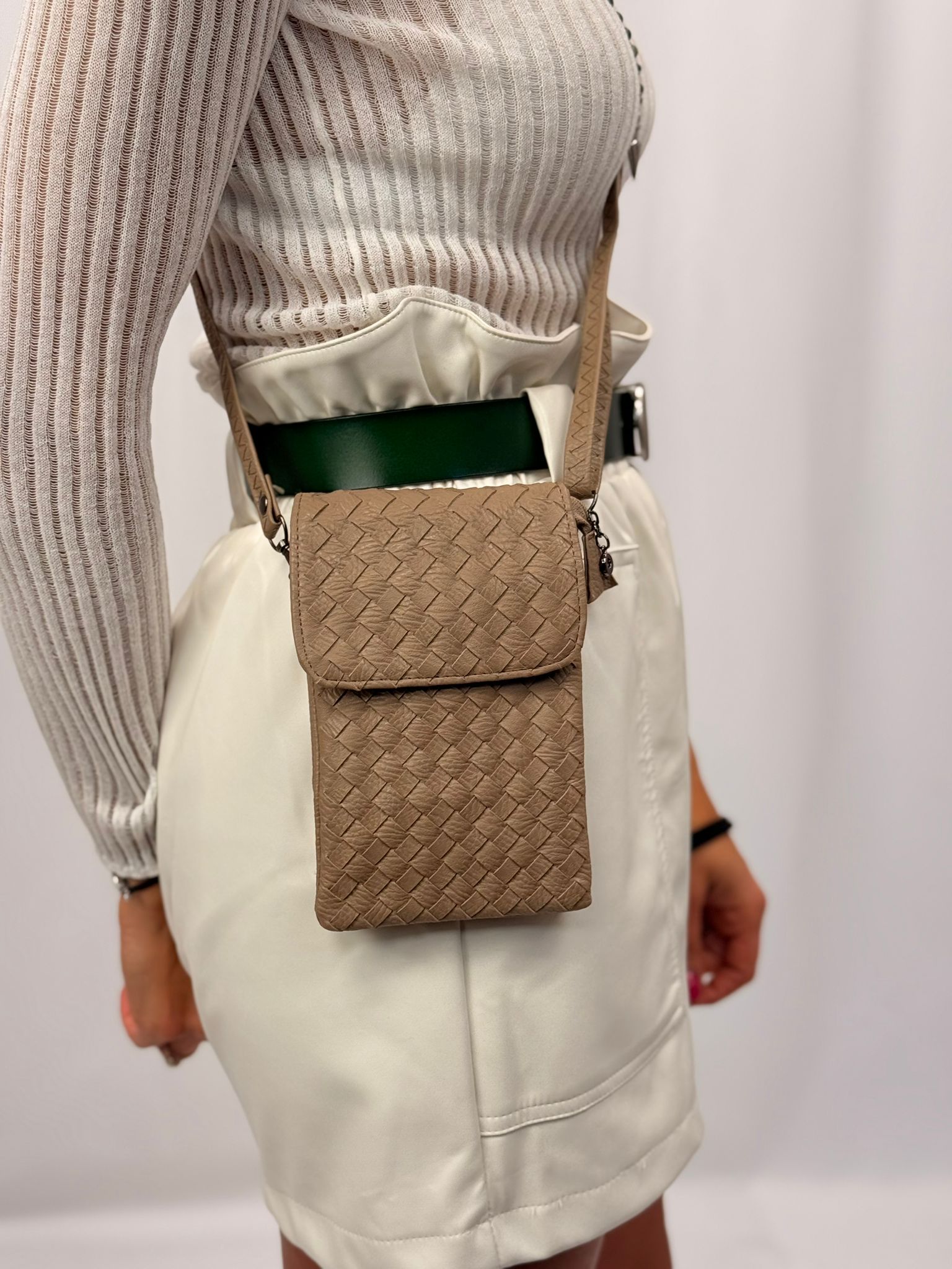 התיק שבתמונה הוא תיק קטן, עשוי חומר דמוי עור עם דוגמת אריגה שמעניקה לו מראה יוקרתי ומסוגנן. צבעו נייטרלי, בגוון קרם, מה שהופך אותו למתאים לשימוש יומיומי או כאביזר אופנתי לאירועים שונים. עיצובו הקומפקטי מתאים לנשיאת פריטים קטנים כמו טלפון, מפתחות או ארנק.